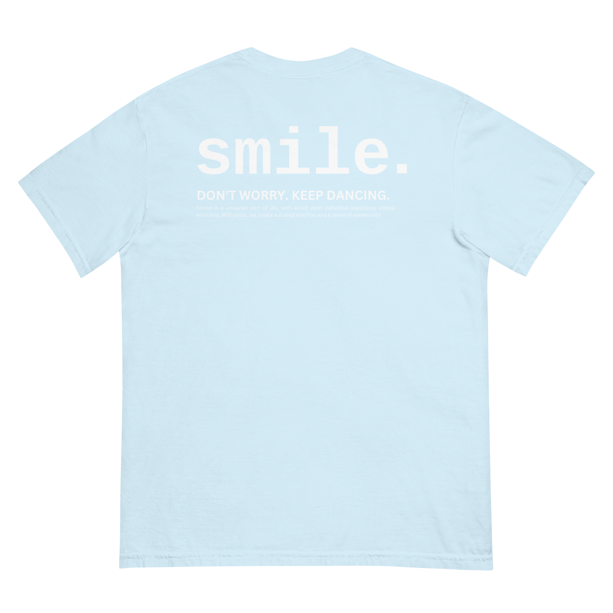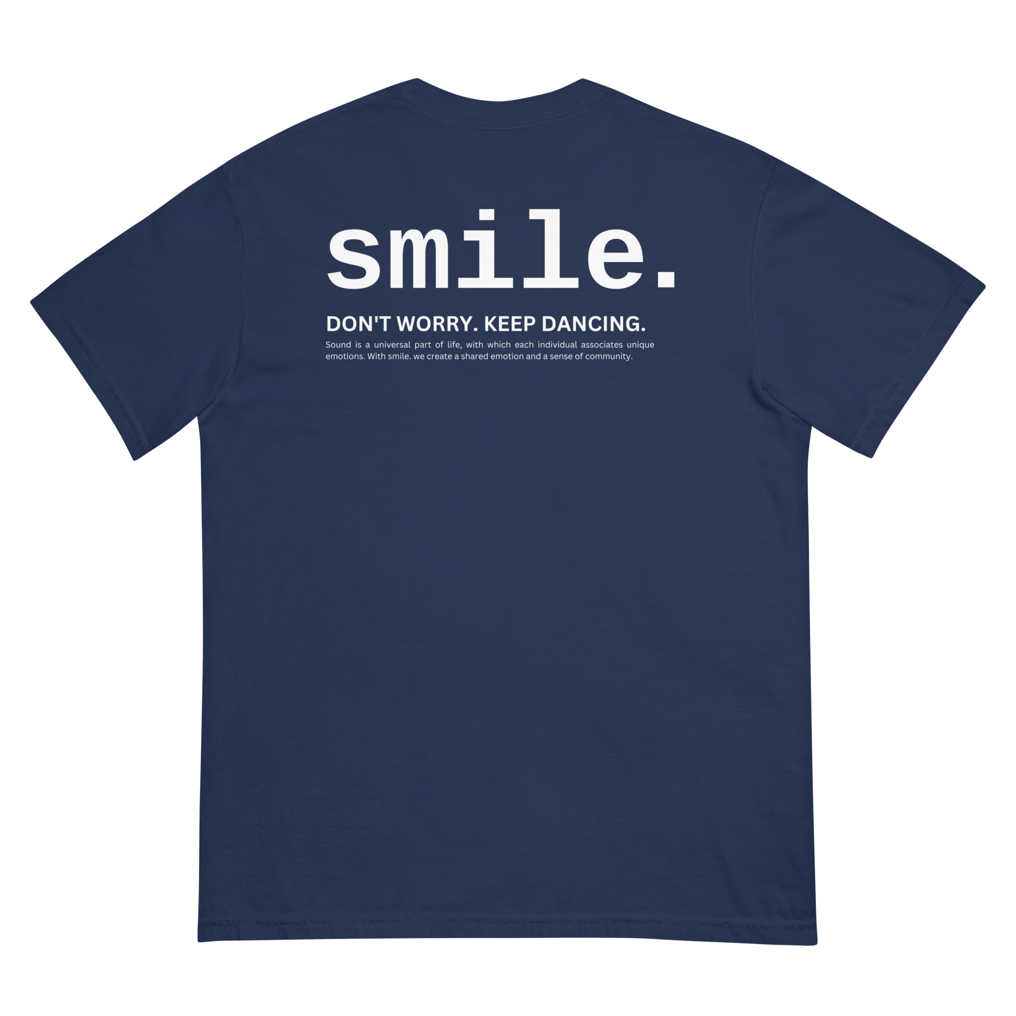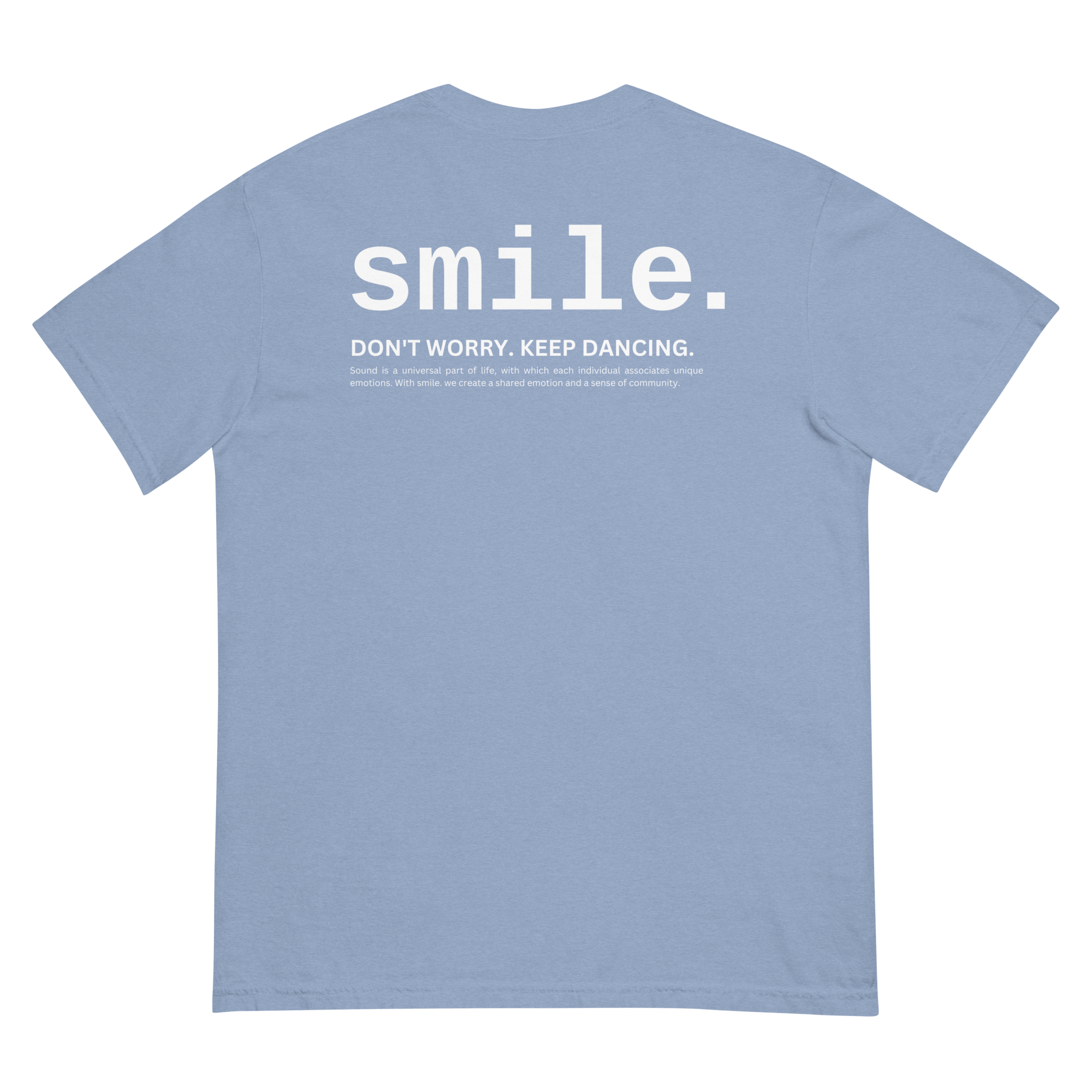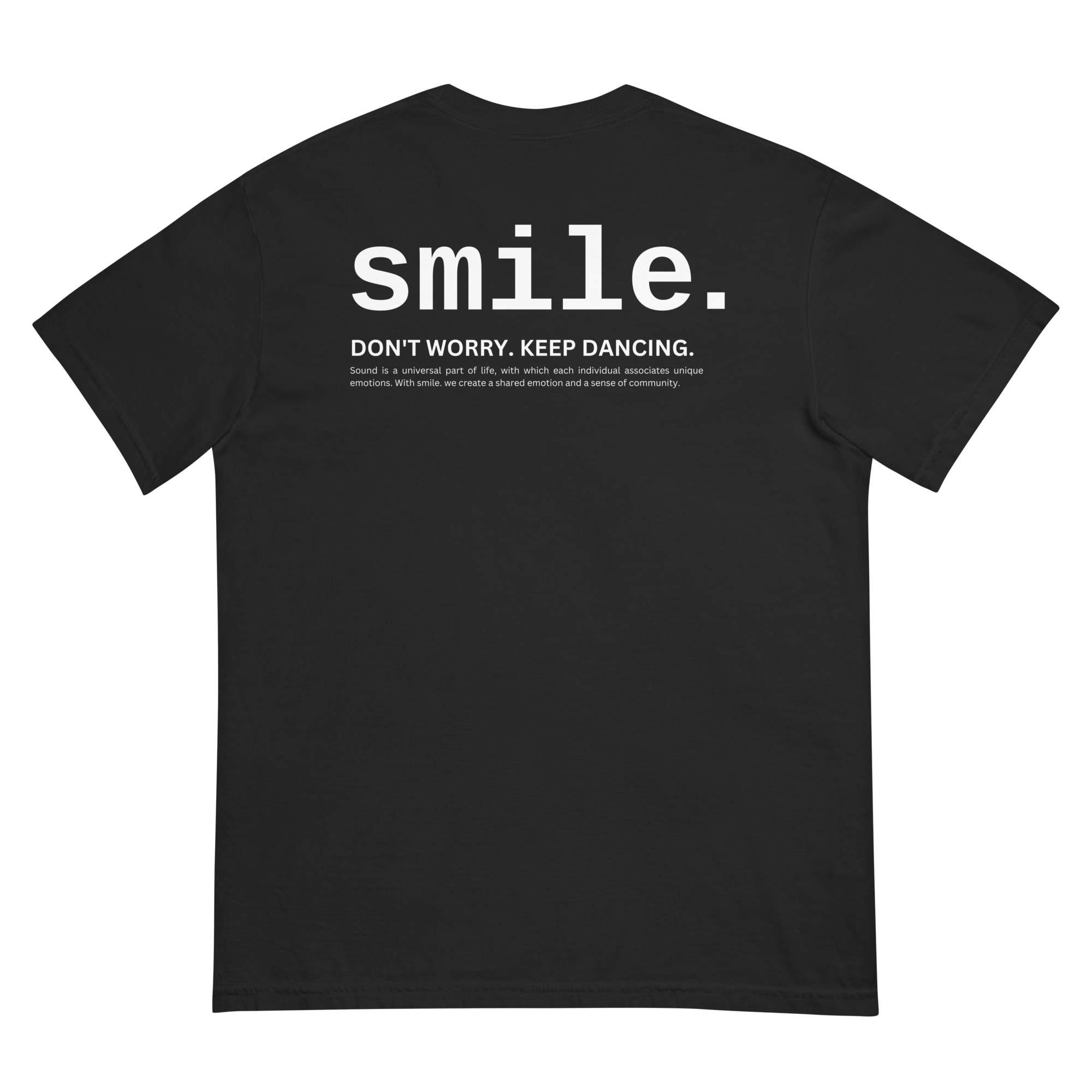 Dieses unisex smile. Shirt 011 Shirt geht wie warme Semmel von den Tresen. Es besteht aus 100 % organischer Baumwolle und ist optimal für Openairs und ein echter Hingucker, wenn du deine Freunde auf ein Sekt Mate im Kiez triffst. Mit dem Schriftzug auf der Brust “dont worry. keep dancing.” und einem frischen Druck auf dem Rücken “smile.”, setzt du ein klares Statement. Das gude Stück ist wirklich qualitativ hochwertig, super bequem und das Beste von allem: umweltfreundlich.